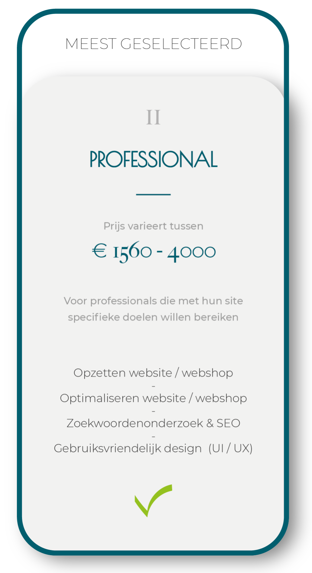 Deze prijzen zijn afhankelijk van de grootte van uw website of webshop. Aan de hand van een vrijblijvend (online) gesprek wordt een offerte opgesteld. Daarnaast zijn deze pakketten uiteraard ook combineerbaar met onze andere diensten. *prijzen exclusief BTW
